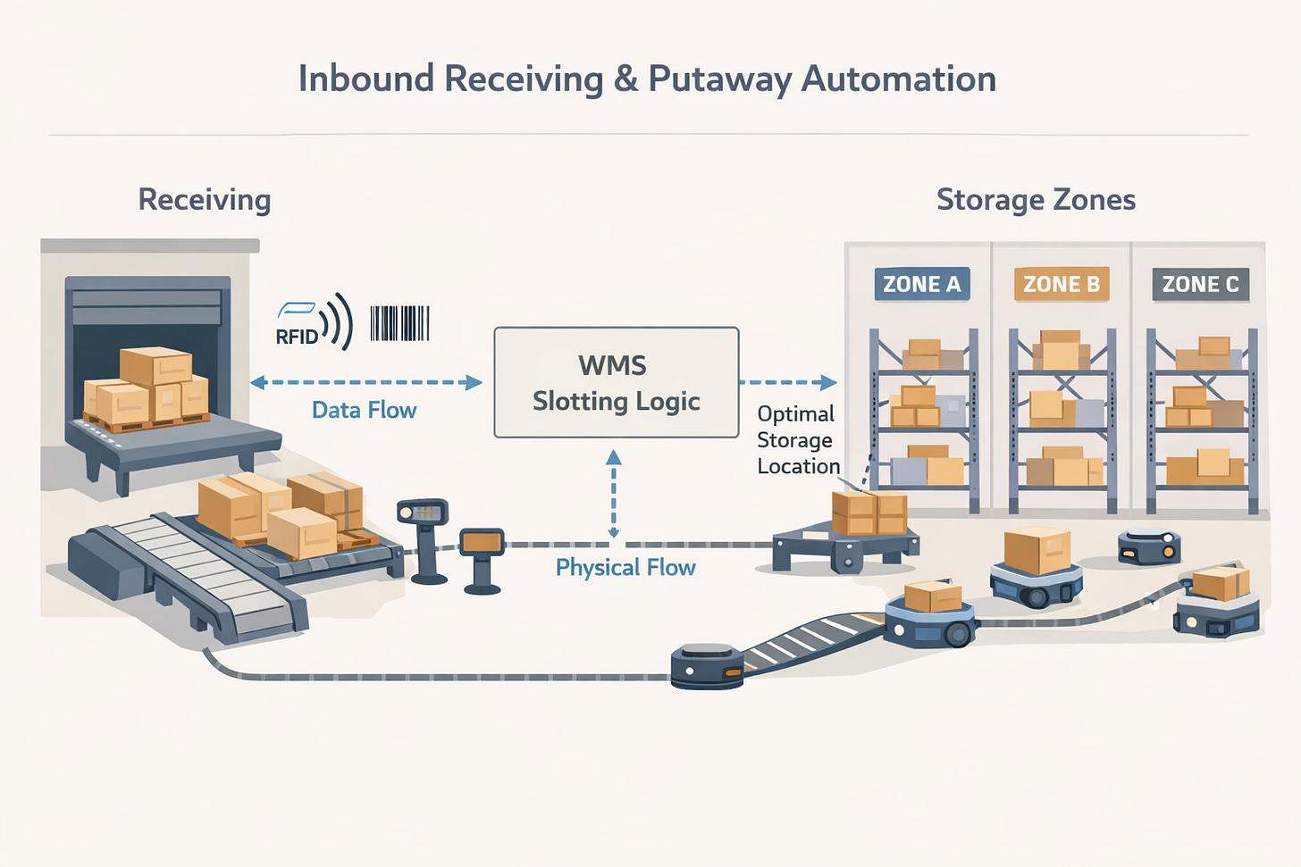 Inbound receiving, inspection, barcode scanning, data validation, and putaway routing.