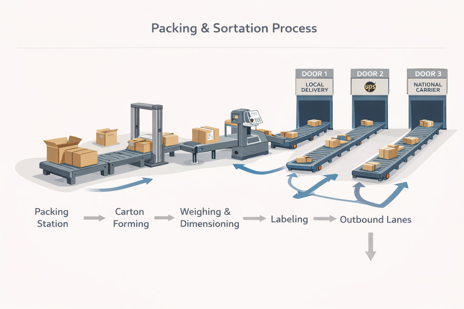 Carton forming, weighing, dimensioning, labeling, and routing packages to the correct outbound lane.