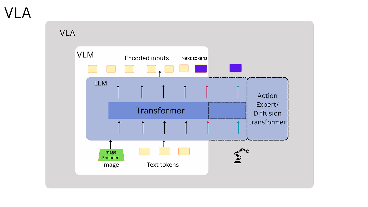 Vision Language Model has excellent generalization as they were trained on large multi-modal datasets of images and videos. For effective robotic control and manipulation having just VLM representations is not enough, action data matters. VLA extends VLM with an additional action and observation state tokens