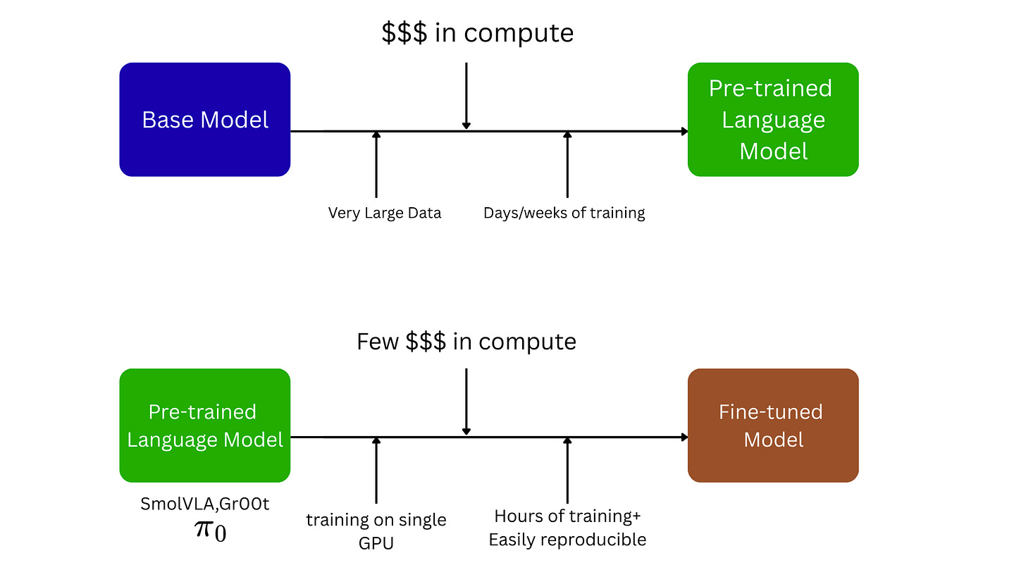 Fine-tuning uses a pre-trained model, such as SmolVLA, Gr00T, OpenVLA, as a foundation. The process involves further training on a smaller, domain-specific dataset. This approach builds upon the model’s pre-existing knowledge, enhancing performance on specific tasks with reduced data and computational requirements. Fine-tuning transfers the pre-trained model’s learned patterns and features to new tasks, improving performance and reducing training data needs. It is already popular in NLP for tasks like text classification, sentiment analysis, and question-answering and is equally very popular in testing things out in Robotics VLA tasks .